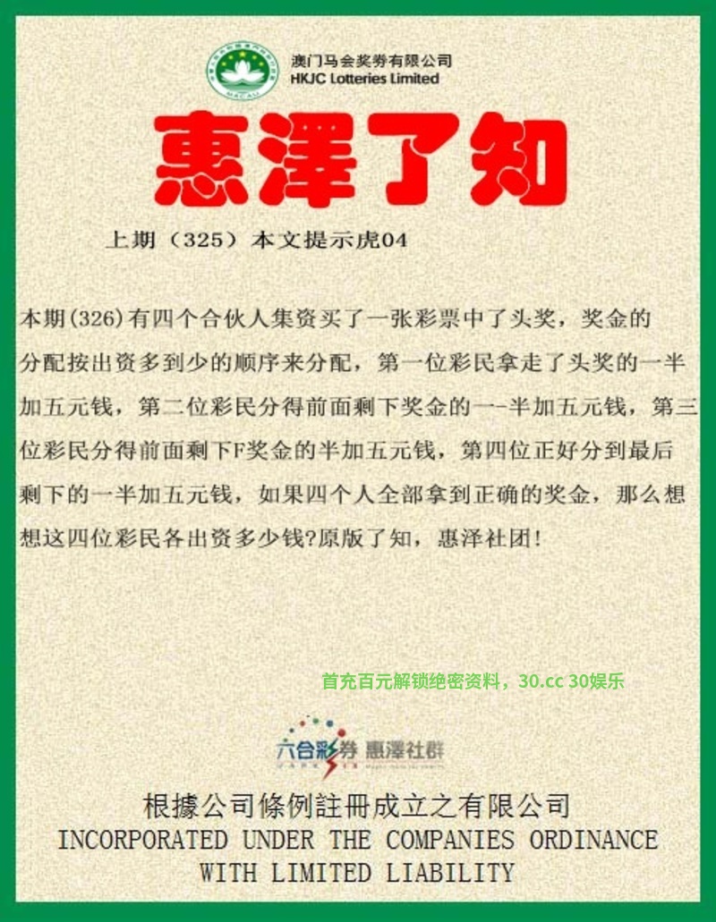 | [惠泽了知] 326期:有四个合伙人集资买了一张彩票中了头奖,合伙解合肖虎牛马鼠羊兔。奖金的分配按出资多到少的顺序来分配,第一位彩民拿走了头奖的一半加五元钱,第二位彩民分得前面剩下奖金的一-半加五元钱,第三位彩民分得前面剩下F奖金的半加五元钱,第四位正好分到最后剩下的一半加五元钱,如果四个人全部拿到正确的奖金,那么想想这四位彩民各出资多少钱? [惠泽九肖]:虎牛马鼠羊兔猪狗龙 [惠泽平肖]:虎虎虎 [惠泽平尾]:6666尾 |